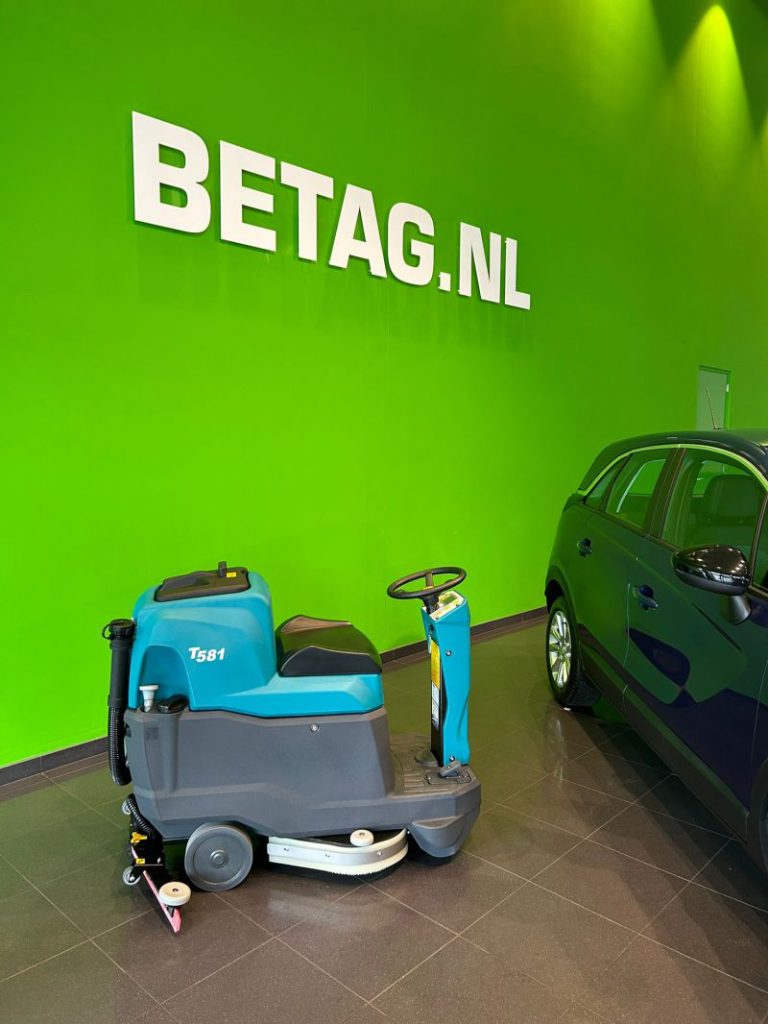 Occasion Centrum Betag in Beilen kiest voor stralend schone showroom- en werkplaatsvloeren. Want als vooruitstrevend autobedrijf weet Betag als geen ander hoe belangrijk een representatieve uitstraling is. Om de bedrijfsvloeren schoon en veilig te houden, heeft Autobedrijf Betag gekozen voor de krachtige Tennant T581 schrobmachine.